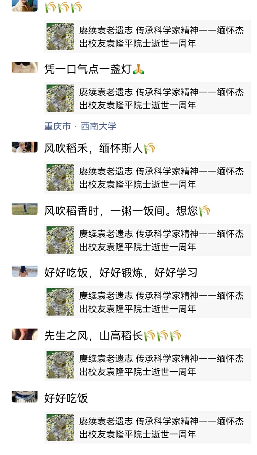 “我怀着无比沉痛的心情前来悼念袁隆平爷爷,不知不觉您已离开我们一年了,一直有种您还在网络上逗我们笑,在家中研究水稻的错觉。看着您手捧水稻满面笑容的雕像,眼里不禁泛起了泪花,敬一杯美酒寄思念,献一束鲜花祭亡魂,生命的消逝不是终结,袁隆平爷爷您将永远活在我们心中。”