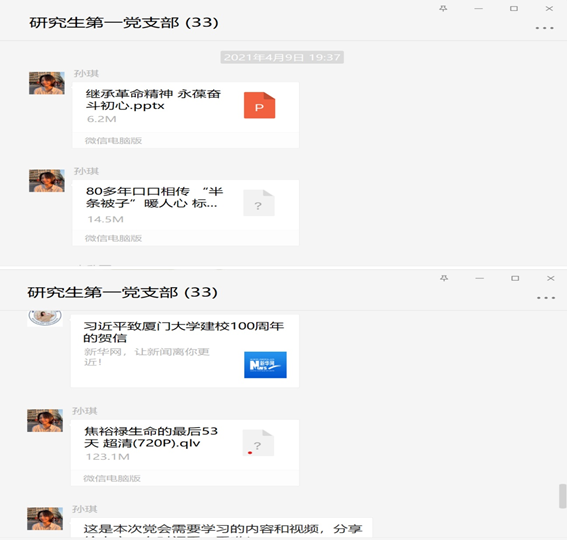 除唐薇老师和丰教授的讲授之外,研究生一支部全体党员采用线上学习的方式,重温了习近平总书记在党史学习教育动员大会的重要讲话精神和《论中国共产党历史》一书中的篇目,同时还着重了解了全国道德模范龚全珍同志和焦裕禄烈士的故事,并要求全体同志观看了“半条棉被”故事的纪录片和《焦裕禄生命的最后53天》。