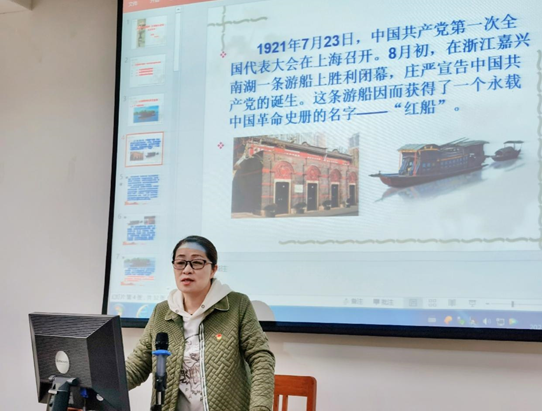 首先由唐薇老师讲授“弘扬红船精神、不忘初心使命”主题党史课,她首先引出了中国共产党第一次代表大会召开史,为大家讲解了红船及红船精神的历史由来。