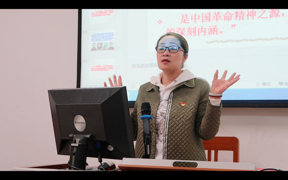她讲到,1921年7月23日,中国共产党第一次全国代表大会在上海召开,8月初在浙江嘉兴南湖一条游船上胜利闭幕,庄严宣告中国共产党的诞生,这条游船因而获得了一个永载中国革命史册的名字——“红船”,习近平总书记于2017年10月31日瞻仰红船时亲切地称“红船”为我们党的“母亲船”。唐老师还为大家介绍了红船精神的深刻内涵,为大家介绍了在2005年6月21日,时任中共浙江省书记习近平同志在《光明日报》发表了《弘扬“红船精神”走在时代前列》的署名文章,首次概括了“红船精神”的深刻内涵和历史地位,具体表现为:“开天辟地、敢为人先的首创精神;坚定理想、百折不挠的奋斗精神;立党为公、忠诚为民的奉献精神;是中国革命精神之源,也是‘红船精神’的深刻内涵。”