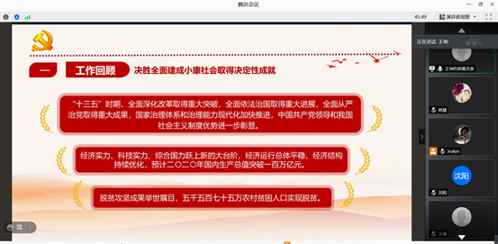 活动中,由刘杰同志带领深入学习《中国共产党第十九届中央委员会第五次全体会议公报》,观看中央电视台特约评论员解读公告的视频等方式,组织全体党员们全面、系统学习党的十九届五中全会精神,同时观看党的十九届五中全会精神的新闻发布会,认真聆听全会精神的介绍和解读,全面掀起学习宣传贯彻全会精神的浓厚气氛。同时党支部还组织观看了《故事里的中国:扶贫路上》,学习扶贫干部黄文秀同志扶贫精神。最后谭建辉同志和孟祥宇同志结合党的十九届五中全会精神谈学习体会,围绕脱贫攻坚分享了自身在扶贫路上的故事。